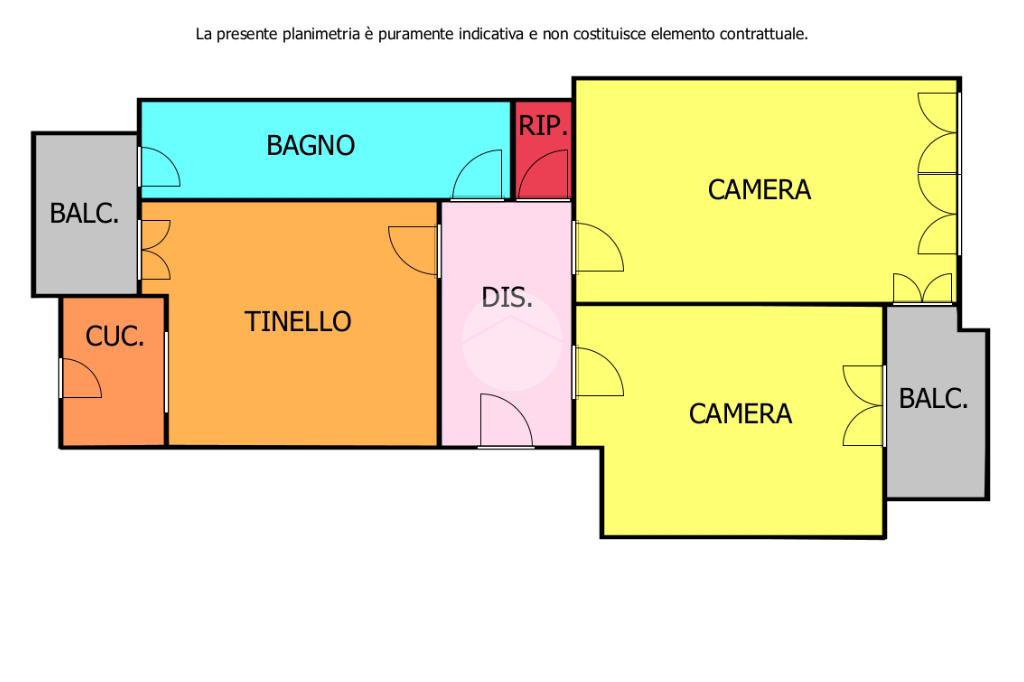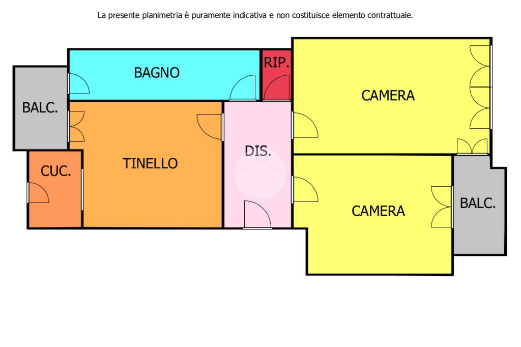 La disposizione prevede un ingresso su disimpegno, due ampie camere da letto, tinello con cucinotto, bagno finestrato con box doccia (ristrutturato circa 20 anni fa), ripostiglio e due balconi, oltre a una cantina di pertinenza al piano interrato.