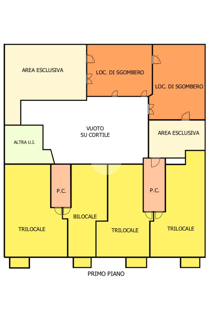 - Piano terra: ingresso dal passo carraio, accesso alle due scale, Bilocali, Monolocale, Magazzini, Box auto, cortile di 200 mq circa, una cantina di 15 mq.